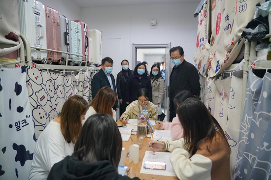 各负责人仔细查看学生线上学习状态,观摩了教师线上授课、师生互动、课堂氛围等情况。叮嘱同学们要合理安排学习与生活,自觉遵守学校疫情防控有关规定,认真做好自身防护和体温监测情况。随后,实地检查了学生公寓疫情防控工作、卫生状况、安全管理等情况。