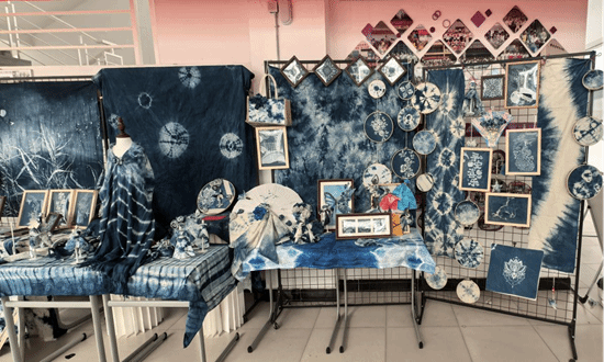 作为必赢242net官网美术课程实践教学的重要成果展示,本次展览以“艺脉绵延润初心,美育同行向未来”为核心主题,鼓励学生结合色彩心理学、儿童发展心理学等专业知识,围绕儿童成长需求开展创作。扎染系列作品成为本次展览的吸睛焦点:展厅内以靛蓝为主色调的作品群,将传统扎染工艺与现代艺术表达相融合——从晕染出云雾纹理的布景织物,到点缀着蓝白花朵的装饰摆件,再到迷你扎染服饰模型,深浅交织的蓝白纹样既传递着非遗技艺的古朴质感,又以灵动的造型适配儿童审美。该系列创作者2023级学前教育专业学生团队介绍:“我们以‘青蓝’为核心风格,在扎染基础技法上加入立体装饰、场景化陈列的巧思,既展现传统工艺的美感,也希望让小朋友在触摸、观察中,直观感受到非遗的温度,实现审美熏陶与文化启蒙的结合”。
