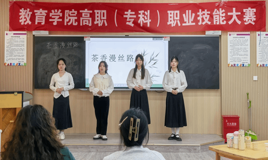 大赛以“以赛促学、以赛促教、以赛促改”为宗旨,聚焦教育类专业核心能力,全程采用抽签定序,确保公平公正。赛事分上下半场进行:学前教育团队围绕“玩中学”理念,开展趣味教学展示;小学教育团队则融合书法、舞蹈、茶文化等元素,通过技能讲解与情景模拟实现传统文化与学科教育有机融合。